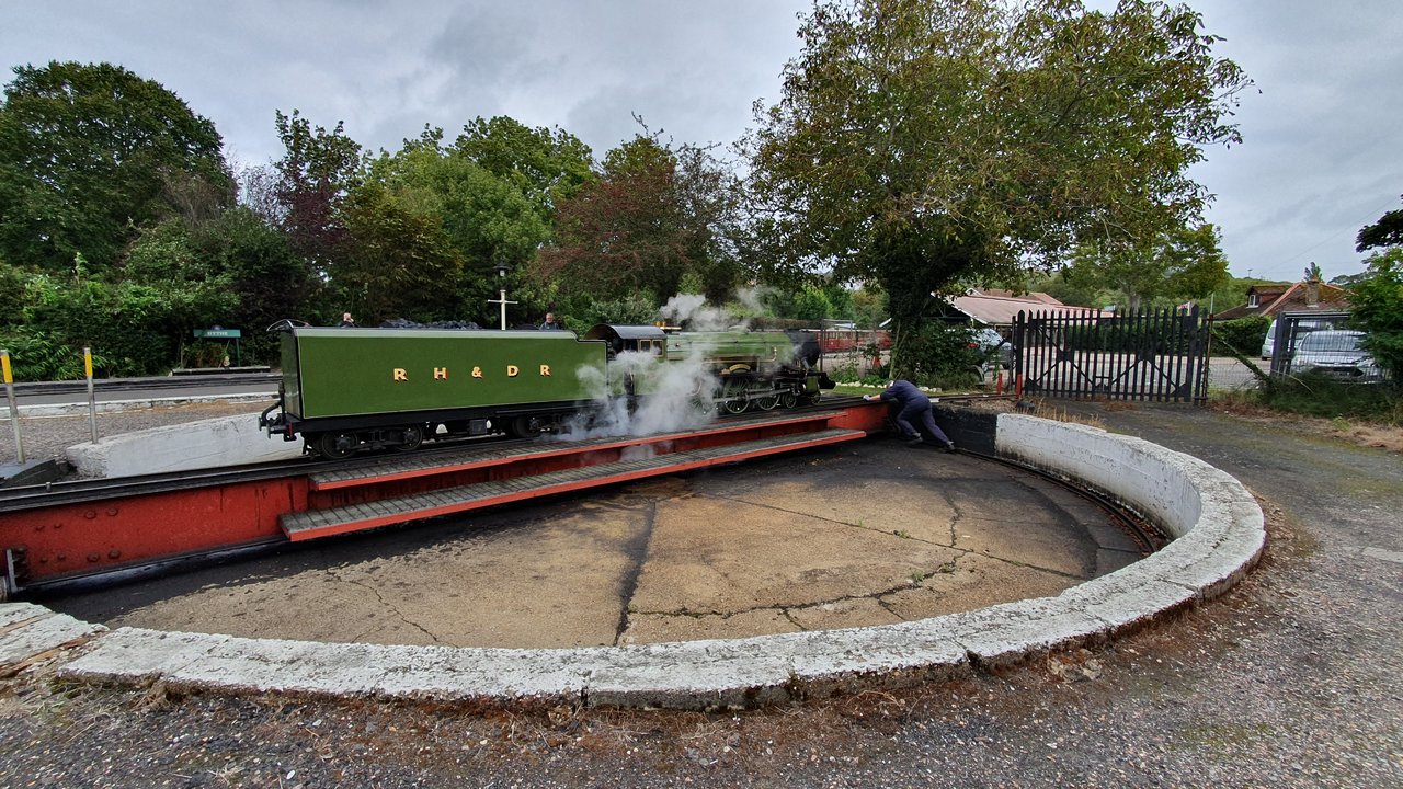 Wärend im Endpunkt Dungeness eine Kehrschleife dem Wenden der Züge dient, übernimmt das in Hythe eine Drehscheibe.